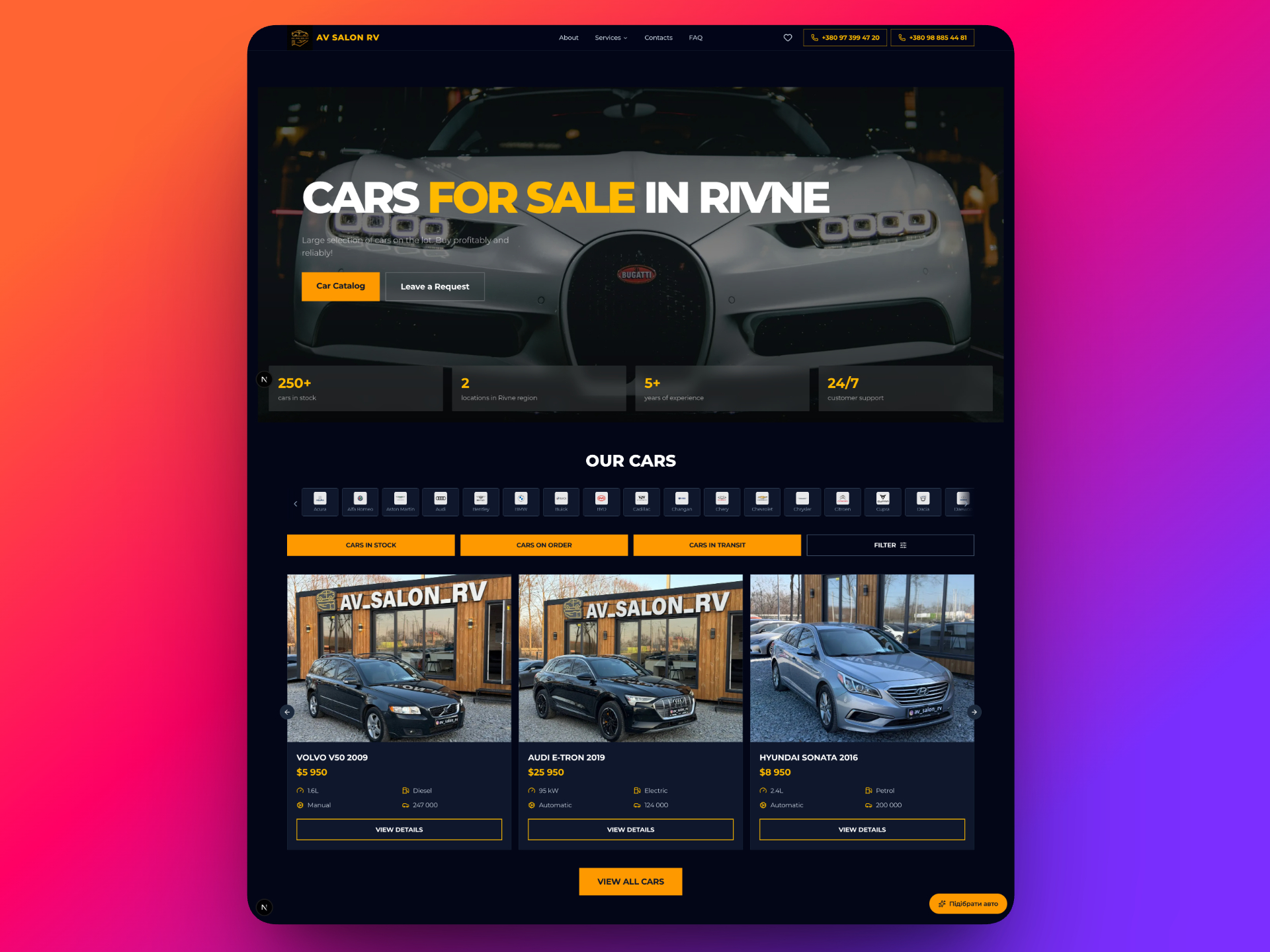 AV Salon RV is a car dealership in Rivne, Ukraine. We built a full-featured website with a car catalog, admin panel, Telegram bot integration, and a delivery cost calculator.