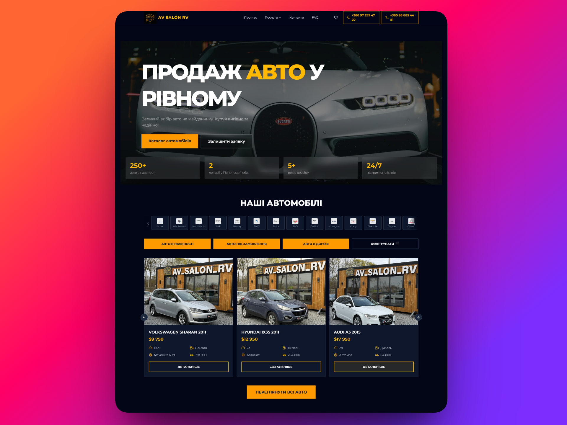 AV Salon RV — автосалон у Рівному, Україна, з двома майданчиками у Рівненській області та флотом понад 250 автомобілів. Клієнту потрібна була сучасна веб-платформа для демонстрації каталогу, залучення покупців та автоматизації щоденних операцій — від публікації нових надходжень до обробки заявок клієнтів.